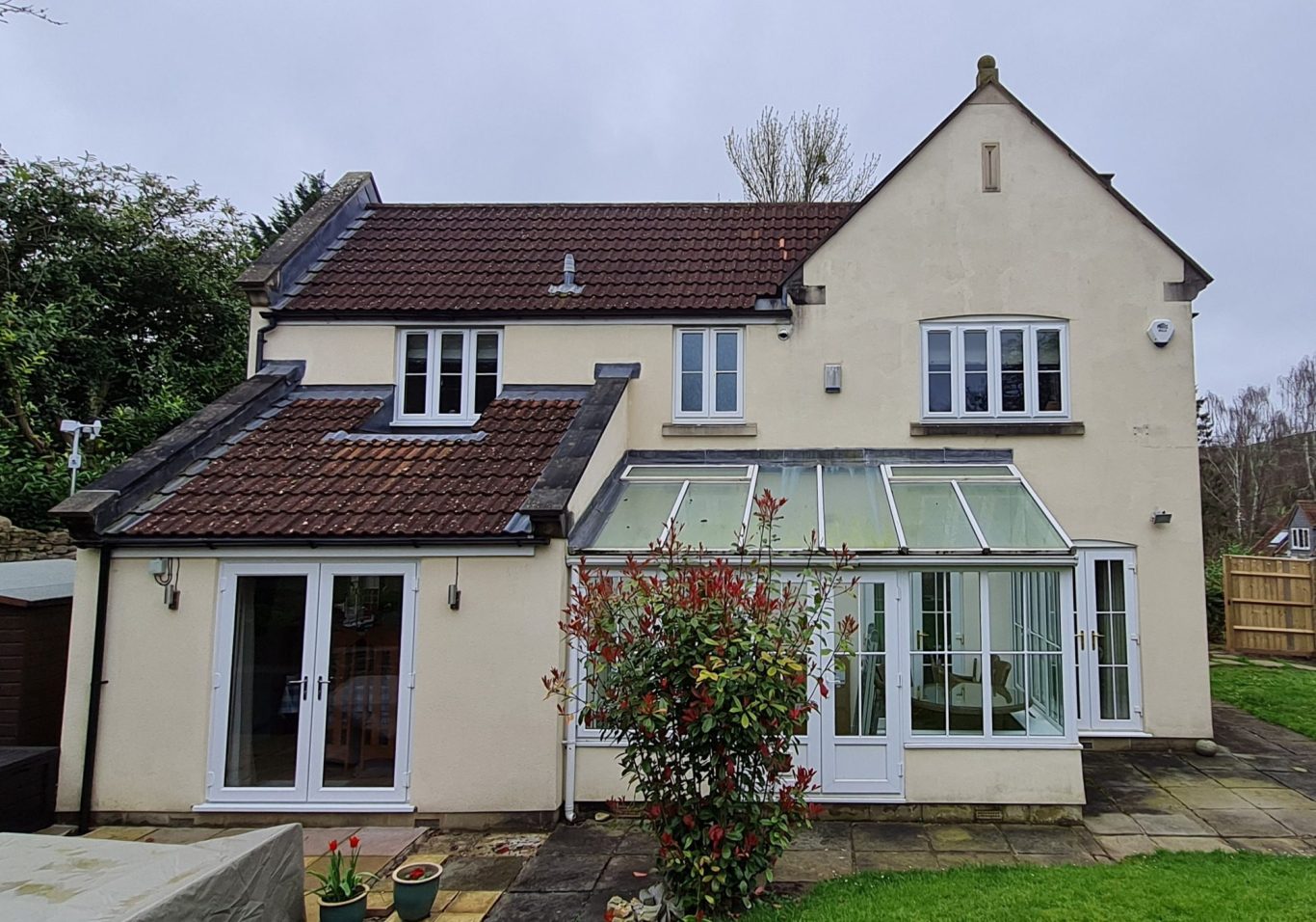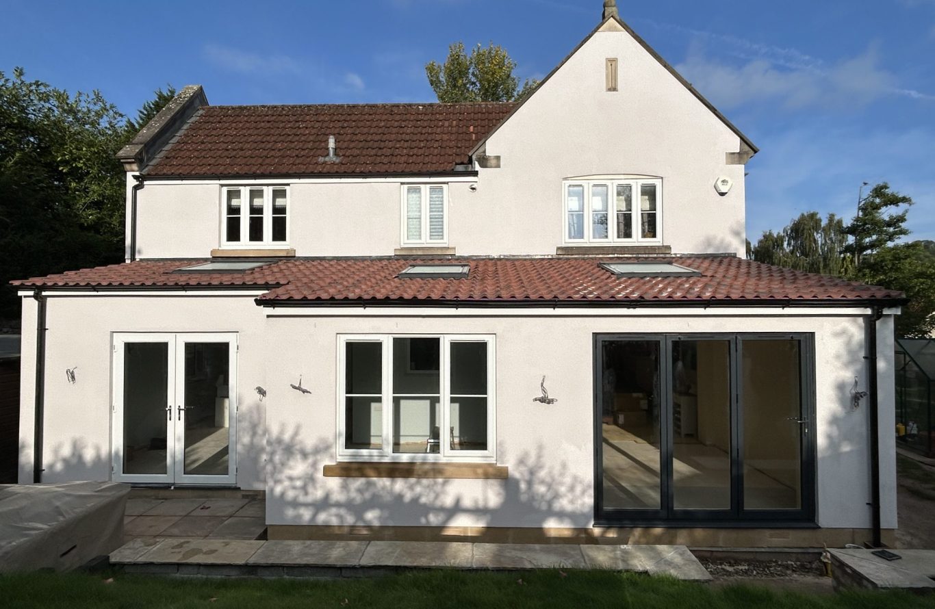 The new roof spanning over the new extension and existing kitchen with large rooflights creates a seamless design and provides plenty of light into the existing kitchen and lounge / garden room.